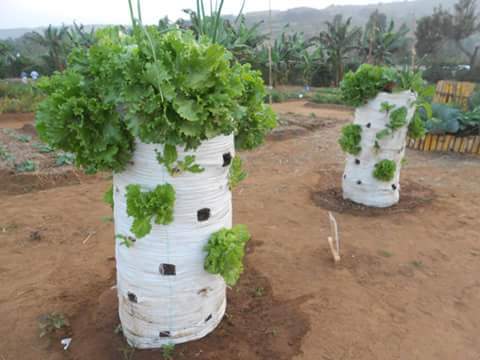 VifaaUdongo, Kokoto (mawe madogo madogo), Gunia, mchanga/Pumba za mpunga (Rice husk), Mbole ya samadi iliooza vizuri, mti/mbao na kopo dogo (sadolini).Udongo – Kwa ajili ya kuwezesha mmea kusimama, pia kupatia virutubisho mmeaMchanga/Rice husk – Kusaidia mizizi kupita kwa urahisi, pia kuweka mazingira mazuri ya hewa na maji katika udongo yaani mzunguko wa maji na hewa. Kokoto – Kusadia maji kupita ndani ya gunia toka juu hadi chiniMbolea ya samadi – Kutoa virutubisho kwa mmeamti/Mbao – Kusaidia gunia lako kusimama vyema/ imaraHatua za utengenezaji. (i) Changanya udongo wako na mchanga/rice husk pamoja na mbole katika uwiano wa 5:2:1. 5 udongo, 2 samadi, 1 Mchanga/rice husk.(ii) Toboa kopo lako na ondoa kitako ili kuweka uwazi pande zote mbili (juu na chini)(iii) Weka mti/ubao katikati ya gunia ukiuchimbia ardhini kisha weka kopo lako katikati ya mti/mbao hiyo na lijaze kokoto (iv) Weka udongo uliochanganywa vizur kwenye gunia lako ukilizunguka kopo lenye kokoto hadi kufikia kimo cha kopo. Baada ya hapo ondoa kopo na hakikisha kokoto zinabaki zikizungukwa na udongo.(v) Weka kopo juu ya kokoto zilizozungukwa na udongo kisha, lijaze kopo hilo na kokoto, rudia kujaza udongo ukilizunguka kopo hadi kimo cha kopo hilo. Endelea kufanya hivyo (kama hapo juu) hadi pale gunia lako litakapokuwa limejaa. (vi) Toboa gunia kwa kuweka matundu kuzunguka gunia kwa ajili ya kupandia katika umbali sawa (inategemea na aina ya mboga) (vii) Hapo utakuwa tayari kupanda mbegu zako ama mche wa mboga aina yoyote juu na pembeni ya gunia lakoMboga aina ya letuce (Lactuca sativa) Mboga aina ya sukumawiki (Brassica carinata) zikiwa zimepandwa kwenye guniaUangalizi.- Mwagilia mboga yako mara baada tu ya kupanda na kuendelea ikitegemeana ni aina gani ya mboga.- Unapoona magonjwa hasa fangasi wa ukungu na wadudu wa mboga unaweza tumia dawa zisizo za kikemikali za viwandani kama vile majani ya pilipili kichaa, mwarobaini na tumbaku.- Mboga kama sukuma wiki waweza vuna mara kwa mara, kazi yako ni kumwagilia tu.- unatakiwa kubadilisha udongo wako kwa muda mfano. baada ya mavuno 2 ili kuakikisha mboga zako zina pata virutubisho ya kutosha.. ( Hii inategemeana ni aina gani ya mboga)Muhimu: Ukitumia miche kwa siku tatu/mbili za mwanzo usije ogopa kuona miche yako imelala endelea kuimwagilia itasimama tu. Pia katika umwagiliaji hakikisha unamwaga maji katika kati ya guni pale kulipo na kokoto ili kuhakikisha maji yanasamba ndani ya gunia hadi chini.Faidi- Inapunguza utumiaji wa kemikali za viwandani- Gharama za uhitaji wa mboga za majani.- inatumia nafasi ndogo na kutoa kiasi kikubwa cha mboga mboga.