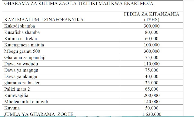 KUMBUKA;Mavuno ya mazao yeyote yale hutegemeana na usimamizi uliokuwa bora katika menejimenti watu, madawa, mbolea na rasilimali pesa kwa ujumla. Kwa kuwa mambo haya hutofautiana baina ya wakulima katika maandalizi ndio utakuta hata mavuno huja tofauti pia. Kuhusiana na gharama hapo juu huweza kuongezeka kidogo au kupungua kutokana na eneo husika, wafanyakazi, au msimu.